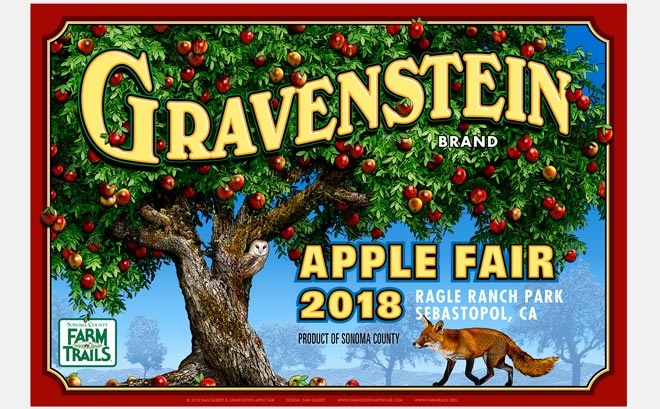 — Thomas P. Jacobsen, Agrilitholigist“Gilbert's Gravenstein Apple Fair posters are the recognized face of the Fair. These are one of my favorite styles of poster art in the county. I love them so much that I have framed and mounted Gravenstein Posters from the last 6 years in my kitchen. Looking for a space right now to hang number 7.”